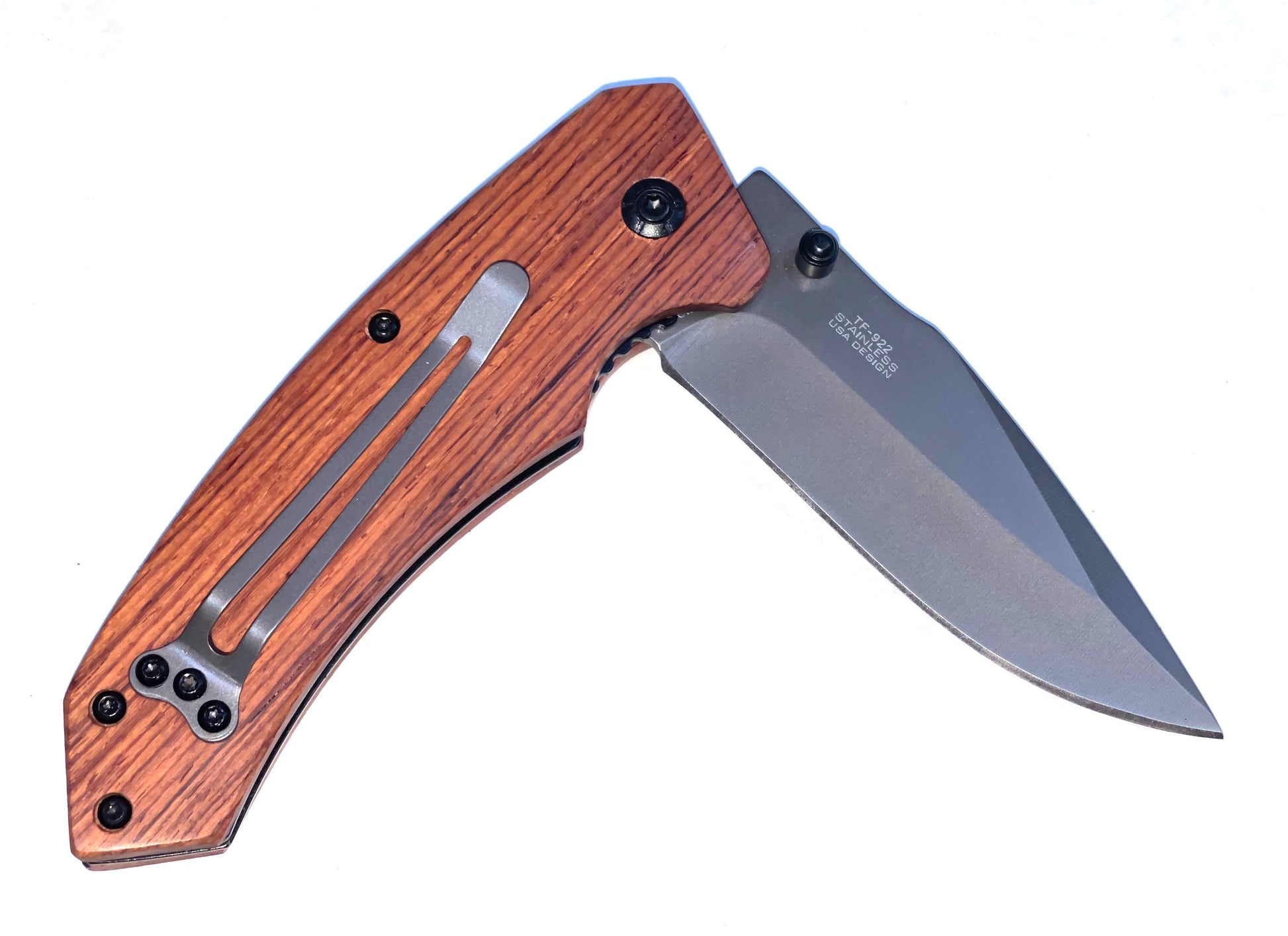 Assisted opening. 4.5" (11.43cm) closed. 3.25" (8.26cm) titanium coated stainless blade. Brown wood handle. Extended tang. Thumb stud. Pocket clip. Boxed.